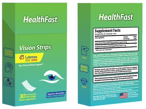 HealthFast Vision Strips are fast-dissolving oral strips designed to support eye and brain health. They contain clinically studied ingredient LUTEMAX 2020TM providing 10 mg Lutein and 2 mg Zeaxanthin.